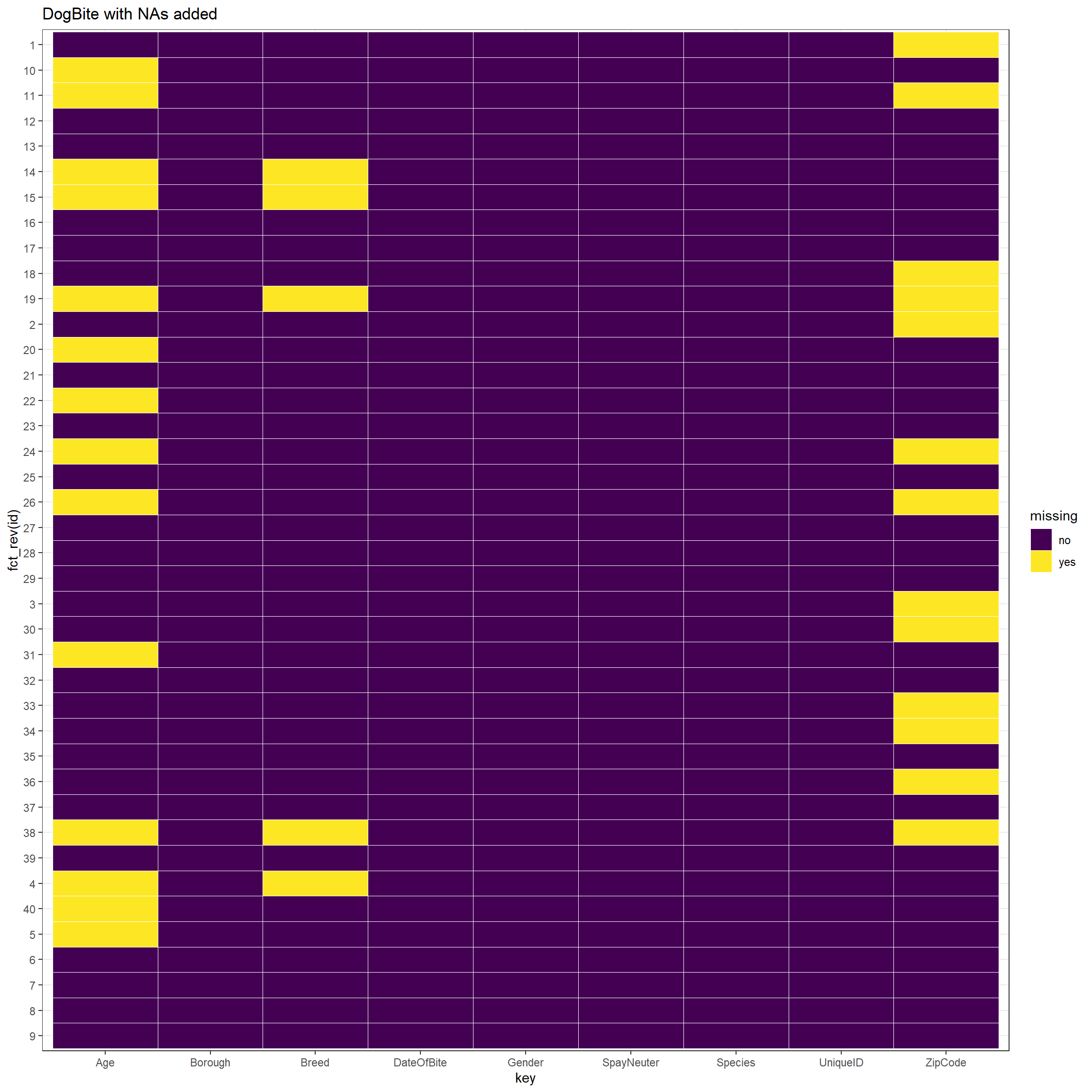 Now we could show the heatmap to analyze the row / column missing patterns and distributions of missing values. In our heatmap, we discover that the vast majority of rows that miss “breed” and “ZipCode” also miss “Age”. There are only 2 exceptions in our 40 sample rows. One possible reason is that the most easily unknown characteristic of dogs is “age”. If dog owners do not know the age of dogs when adopting or purchasing it, it will be difficult to know in the future. However, the “breed” information can be identified through later medical tests, and “ZipCode” can also be queried after the dog bite events. If not even the easily known information of “breed” and “ZipCode” is available, it indicates that the data has limited information about these dogs and dog bite events, so it is easy to miss “age”.