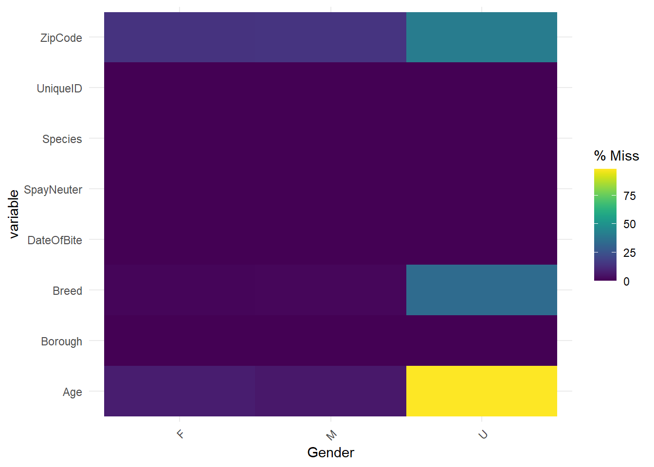 In the plot, “F” denotes “Female”, “M” denotes “Male”, and “U” denotes “Unknown”. The plot shows that most events whose “Gender” is “Unknown” miss “Age”, and about half of these events miss “Breed” and “ZipCode”. However, few events whose “Gender” is “Male” or “Female” miss “Age”, “Breed”, and “ZipCode”, and there is no great difference between the patterns of “Male” and “Female”. We could analyze this situation. As we discussed above, the most easily unknown characteristic of dogs is “Age”. If dog owners do not know the age of dogs when adopting or purchasing it, it will be difficult to know in the future. Although “breed” and “ZipCode” are also easily be missed, they are a little easier to be obtained than “Age”. The “breed” information can be identified through later medical tests, and “ZipCode” can also be queried after the dog bite events. However, the “Gender” information can be identified through observations or medical tests easily. If in an event, we do not even know the gender of the dog, it indicates that the data has limited information about these dogs and dog bite events, it is easy to miss “Age”, “Breed”, and “ZipCode”, especially “Age”. In addition, there is not much difference between patterns of missing values in female and male dogs, since the gender will not influence the patterns.