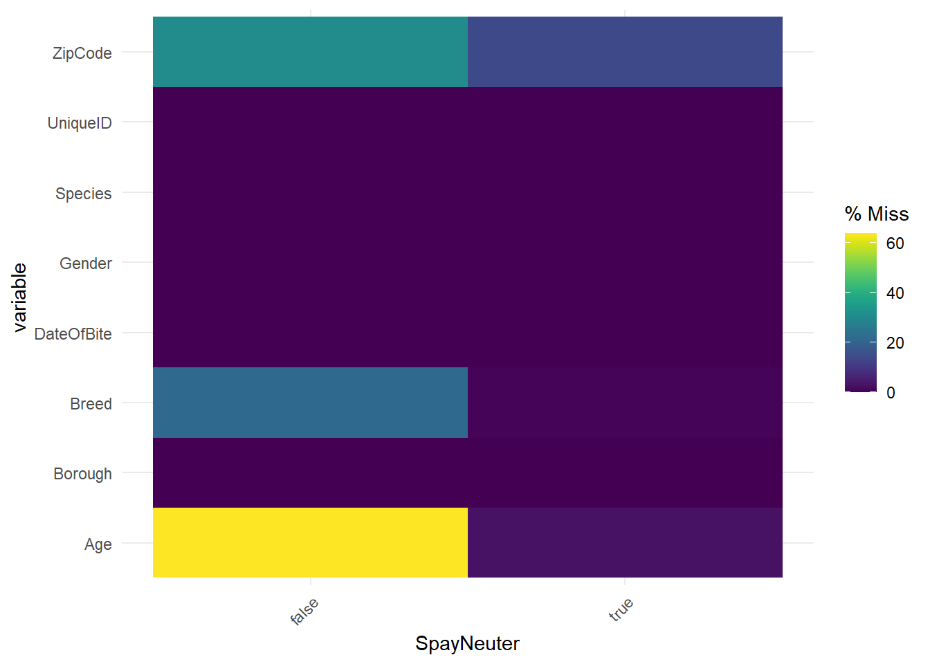 In the plot, “false” and “true” denote the situation of SpayNeuter of dogs. The plot shows that most events whose “SpayNeuter” is “false” miss “Age”, and about half of these events miss “Breed” and “ZipCode”. However, few events whose “SpayNeuter” is “true” miss “Age”, “Breed”, and “ZipCode”. We could analyze this situation. As we discussed above, the most easily unknown characteristic of dogs is “Age”. If dog owners do not know the age of dogs when adopting or purchasing it, it will be difficult to know in the future. Although “breed” and “ZipCode” are also easily be missed, they are a little easier to be obtained than “Age”. The “breed” information can be identified through later medical tests, and “ZipCode” can also be queried after the dog bite events. If in an event, “SpayNeuter” is true, which means the dog is well taken care of and controlled, these careful dog owners are more likely to know the “Age”, “Breed”, and “ZipCode”. By contrast, when it is false, it is more likely to miss “Age”, “Breed”, and “ZipCode”, especially “Age”.