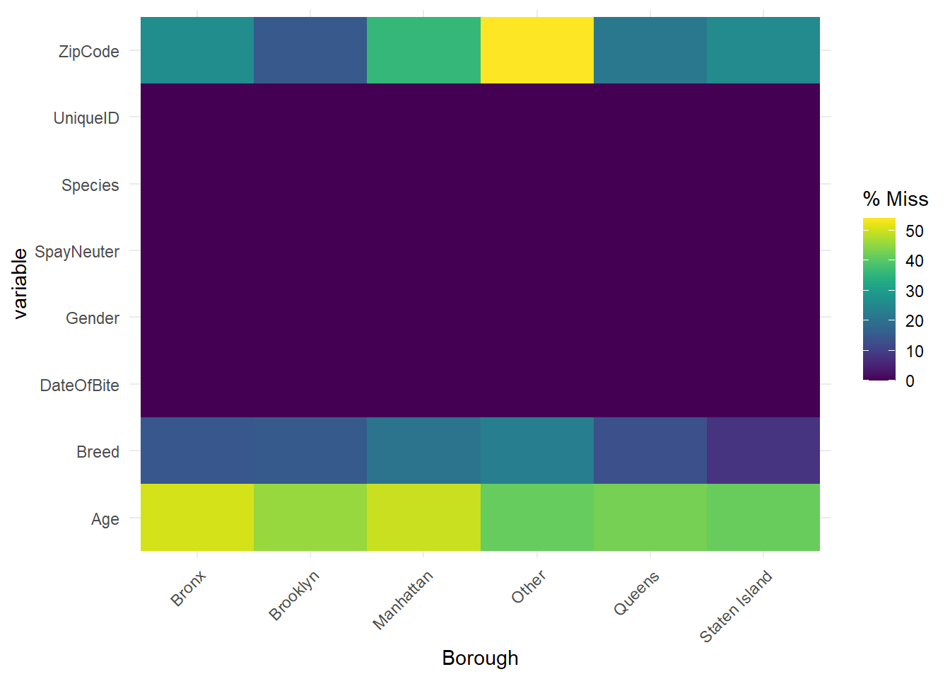 The plot denotes the patterns of missing values in different boroughs. The plot shows that whatever the borough is, it is more likely to miss “Age” than “Breed” and “ZipCode”, which is consistent with what we discussed above. There is one exception. When the “Borough” is “Other”, i.e., we do not know the specific borough, 50% of events miss “ZipCode”. This is reasonable and Prof. Robbins also gave a similar example in class. Since both of “Borough” and “ZipCode” contain the information of the address, there is the connection between them. When we do not know the specific borough, it is likely to miss “ZipCode”.