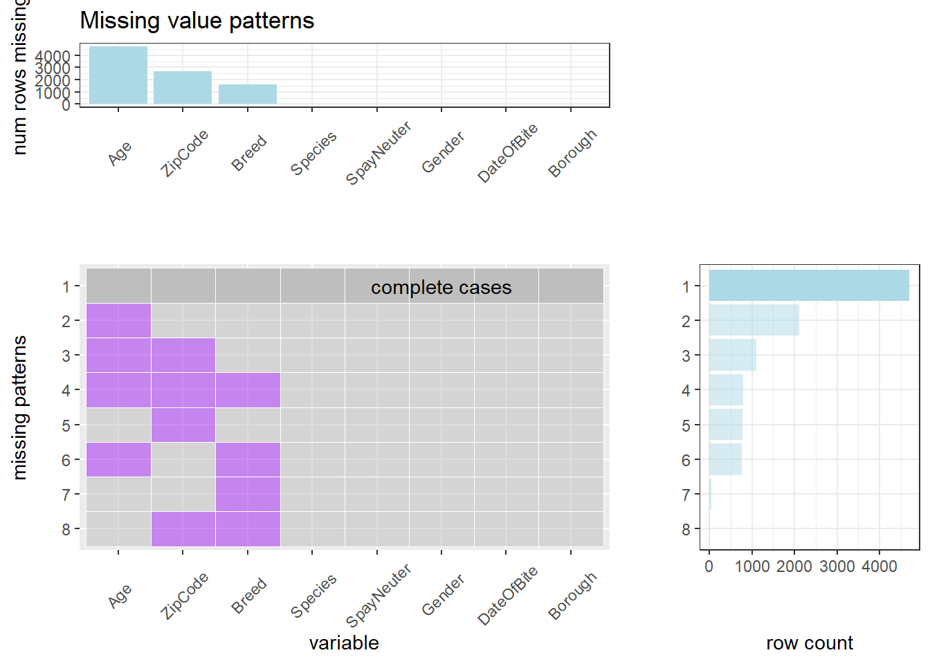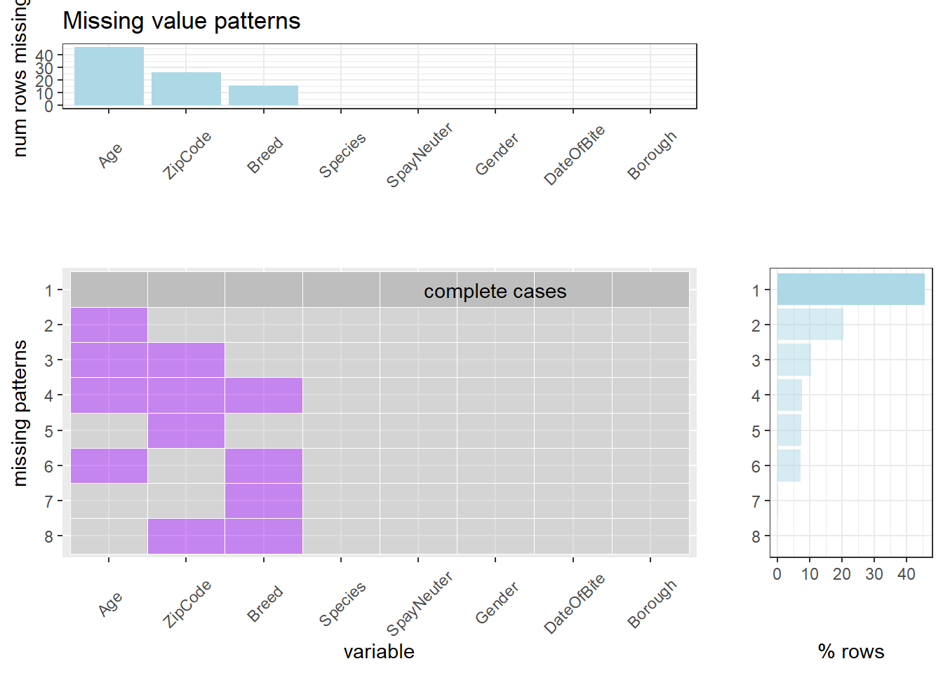 Second, we could analyze the left lower corner, which shows all of the patterns, i.e., miss nothing, only miss “Age”, miss “Age” and “ZipCode”, miss “Age” and “ZipCode” and “Breed”, only miss “ZipCode”, miss “Age” and “Breed”, only miss “Breed”, miss “ZipCode” and “Breed”.