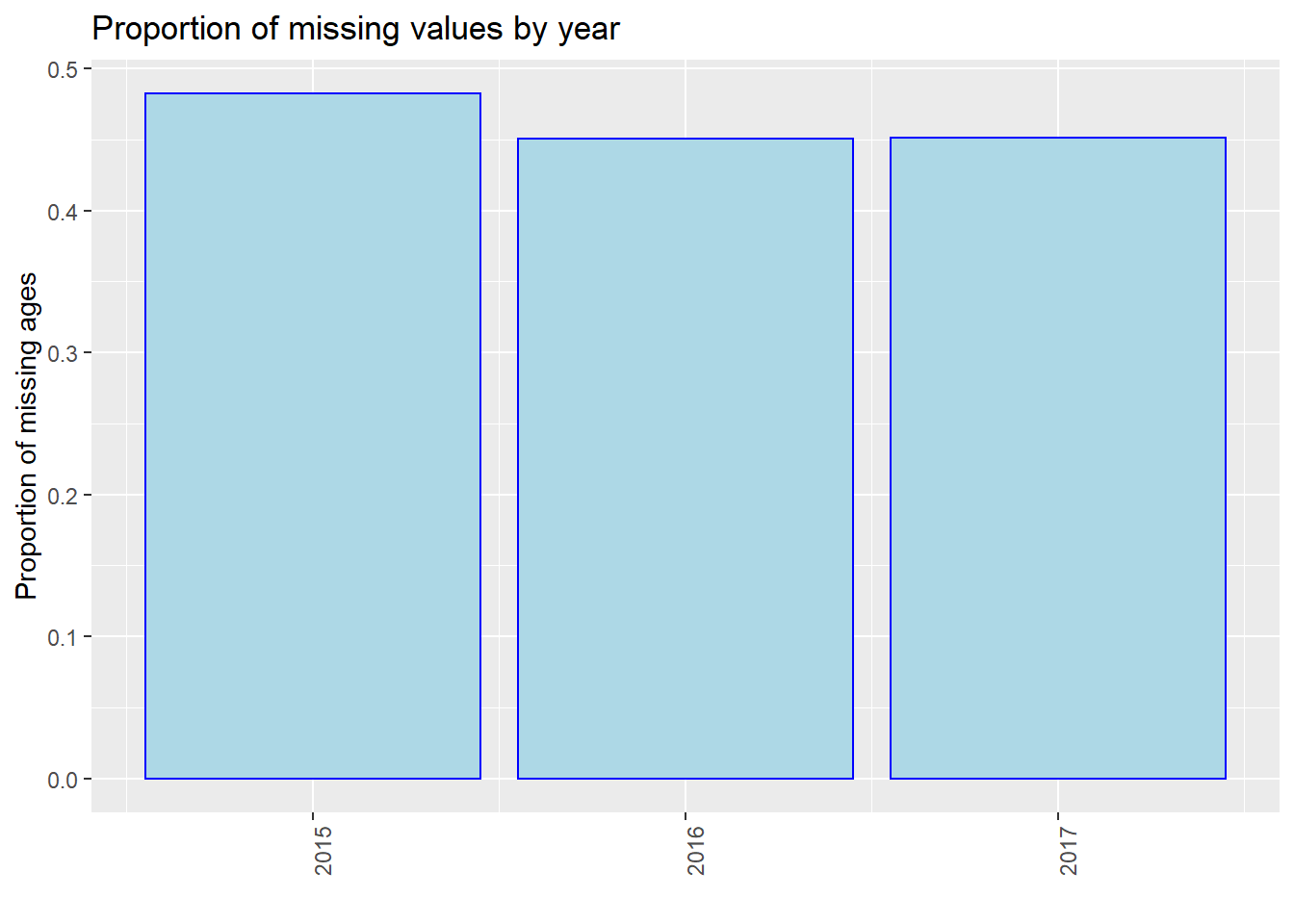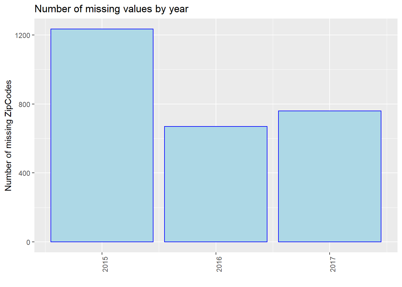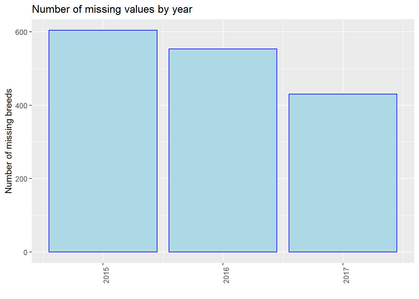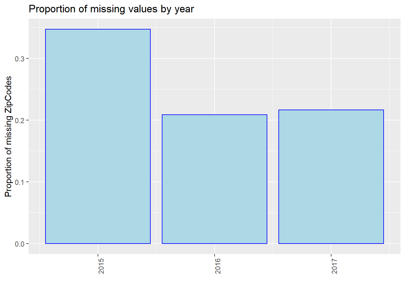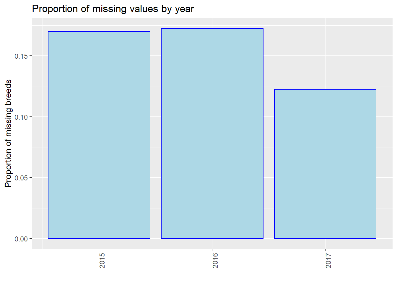 We process our data and show the number of missing values by year, i.e., 2015, 2016, and 2017. Note that we use the entire dataset instead of our 40 samples in this part for better discussion. We use three plots to show the situations of “Age”, “Breed”, and “ZipCode” separately. We could see that in all of the three plots, events in 2015 miss most values. From 2015 to 2017, the number of missing values gradually decreased in total (especially for “Breed”). However, we are not sure whether this is due to the optimization of management, or because the data contained in our dataset in 2015 is the most. Thus, we show the proportion of missing values by year then.