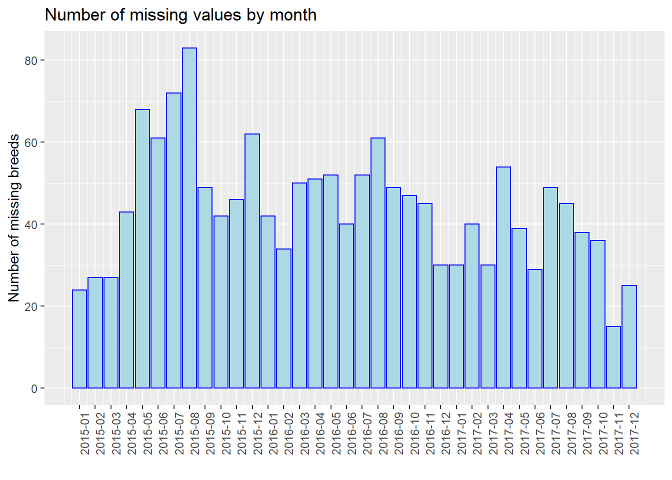 For further analysis, we process our data and show the number of missing values by month, e.g., 2015-01, 2015-02. Note that we use the entire dataset instead of our 40 samples in this part for better discussion. We use three plots to show the situations of “Age”, “Breed”, and “ZipCode” separately. We could see that from 2015 to 2017, the number of missing values gradually decreased in total (especially for “Breed”). In addition, the plot has the periodicity, and the number of missing values increases in summer of each year. However, we are not sure whether this is due to the optimization of management and particularity of summer, or because the data quantity. Thus, we show the proportion of missing values by month then.