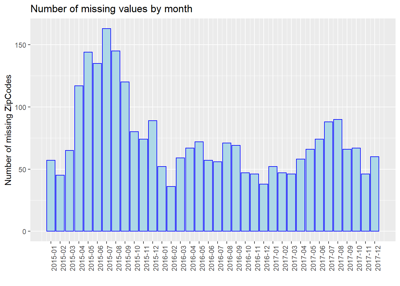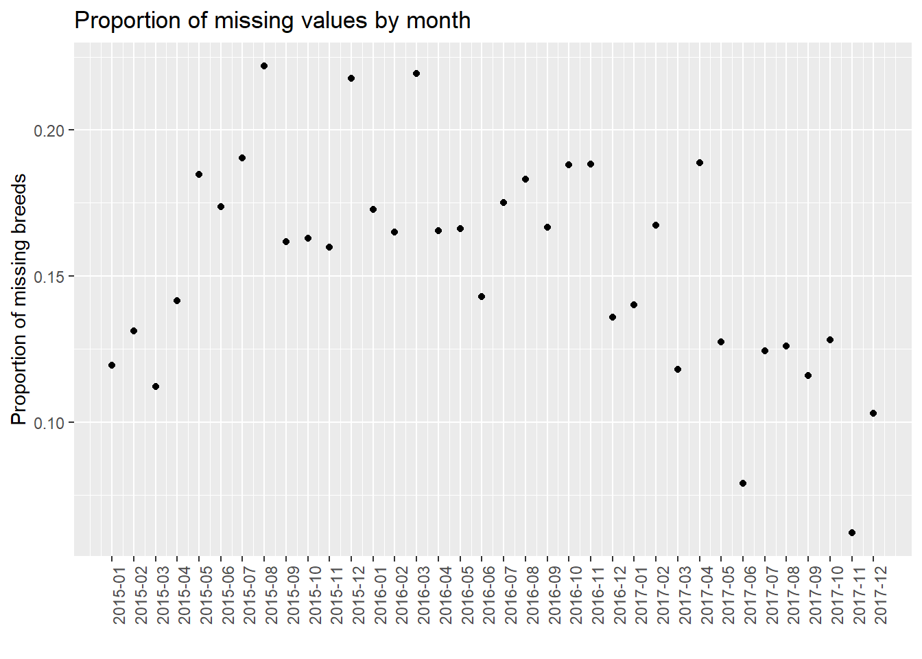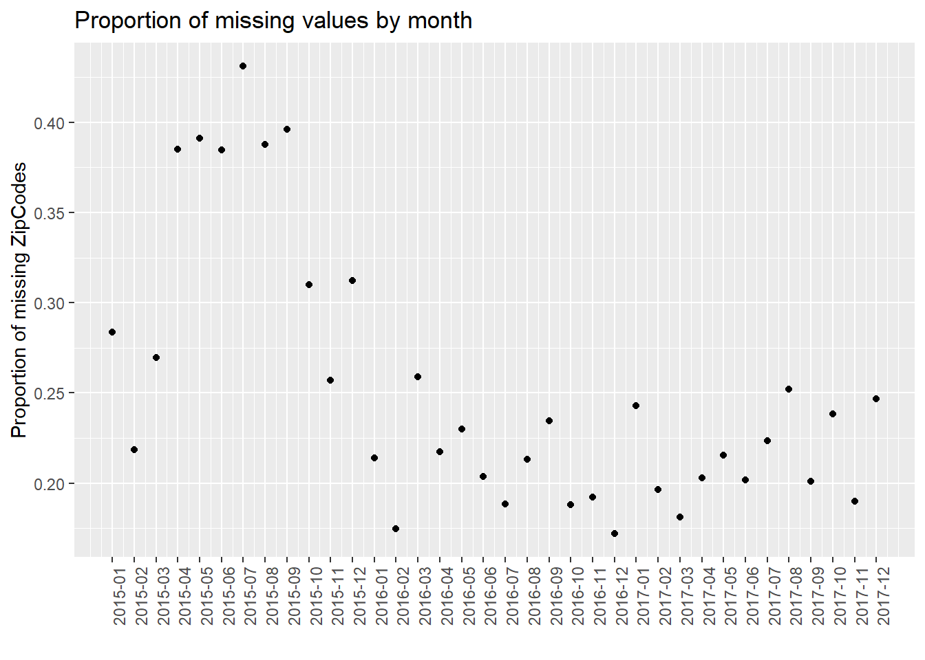 We found that in the proportion of missing values by month, it is clear that as time goes on, the proportion of missing value has a decreasing trend. One possible reason is that the government has strengthened its management of dog bites and put forward higher requirements for data integrity. In addition, the plot has the periodicity, and the proportion of missing values increases in summer of each year. We do not know the reason now. We will further analyze the time series in our final project to try to solve this problem.