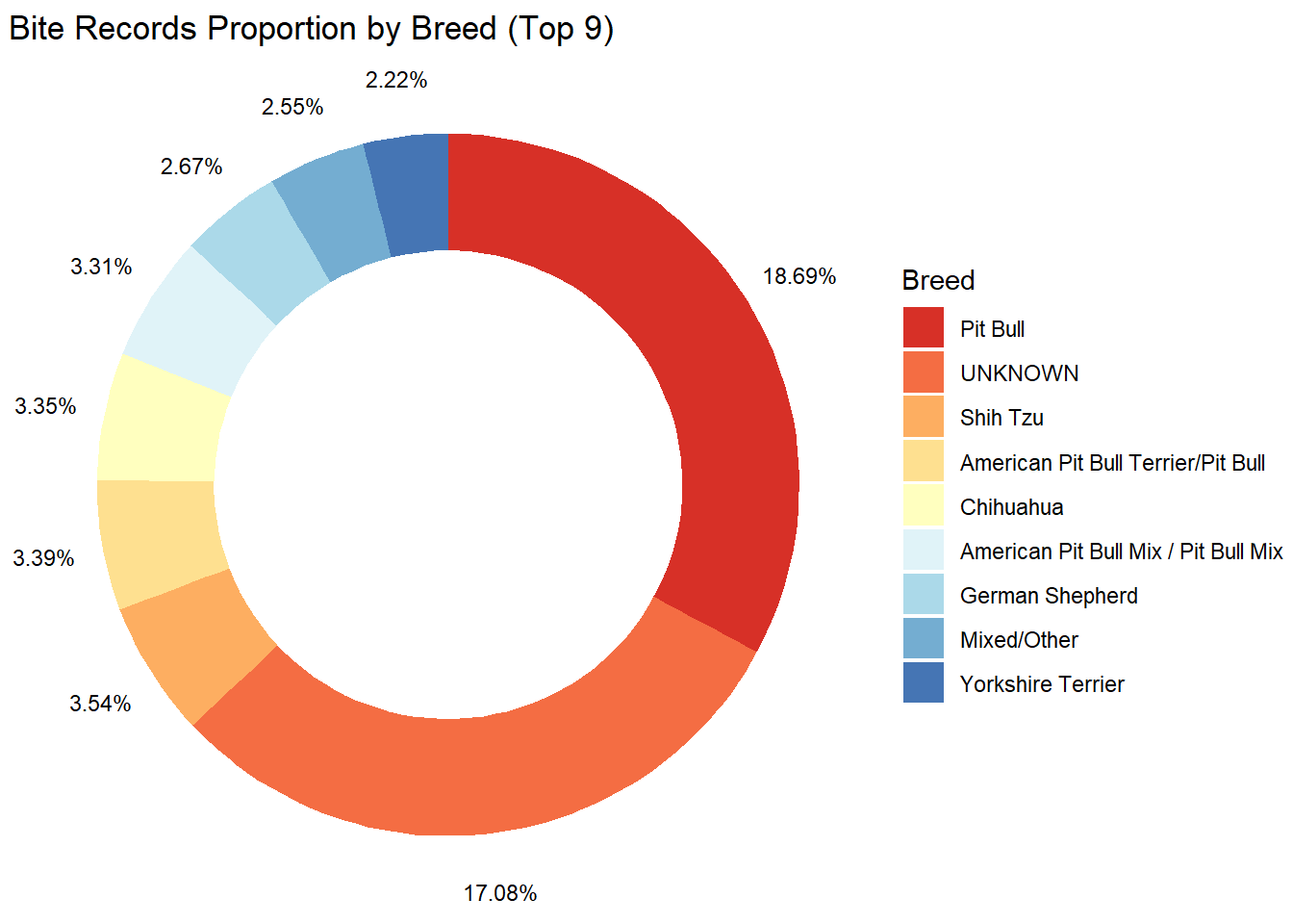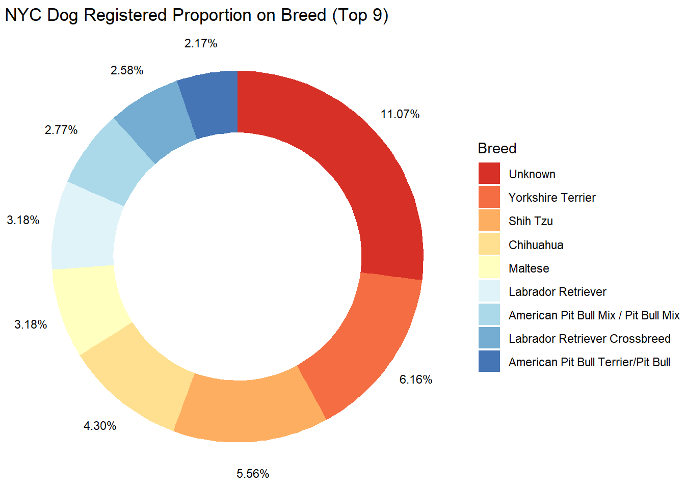 We aim to explore the real reason of this result. For example, why does “Pit Bull” have the highest proportion of biting people? Because a large proportion of dog owners have this breed of dogs and it becomes the most common breed in NYC, or because of its natural potential of being aggressive? To answer this question, we introduce our auxiliary dataset (NYC Dog Licensing Dataset), which is much larger than the dog bites dataset, to roughly estimate the population composition of breeds. This dataset could roughly reflect the composition of dogs in NYC, which is adequate for our discussion. In this auxiliary dataset, we also choose Top 9 breeds with the largest population to draw a donut graph. Top 9 breeds are as follows: UNKOWN, Yorkshire Terrier, Shih Tzu, Chihuahua, Maltese, Labrador Retriever, American Pit Bull Mix / Pit Bull Mix, Labrador Retriever Crossbreed, and American Pit Bull Terrier / Pit Bull.