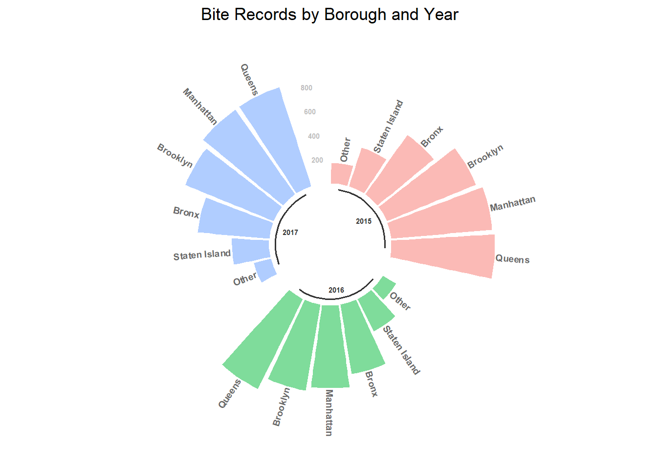 In this part, we analyze the relationship between the number of dog bites and boroughs. We noticed that our Dog Bites dataset contains records of 6 boroughs, i.e., Bronx, Manhattan, Brooklyn, Staten Island, Queens, and Other. We are curious about the distribution of dog bites in different boroughs. First, we draw a nightingale rose chart to show the distribution of dog bites in boroughs in 2015, 2016, and 2017. Except for a slight difference between Brooklyn and Manhattan in 2015 and 2016, the distributions among boroughs of the three years are similar. We found that “Queens” has the largest number of dog bites, and “Manhattan” and “Brooklyn” come second or third. The numbers of dog bites in these three boroughs are similar and much larger than other 3 boroughs.
