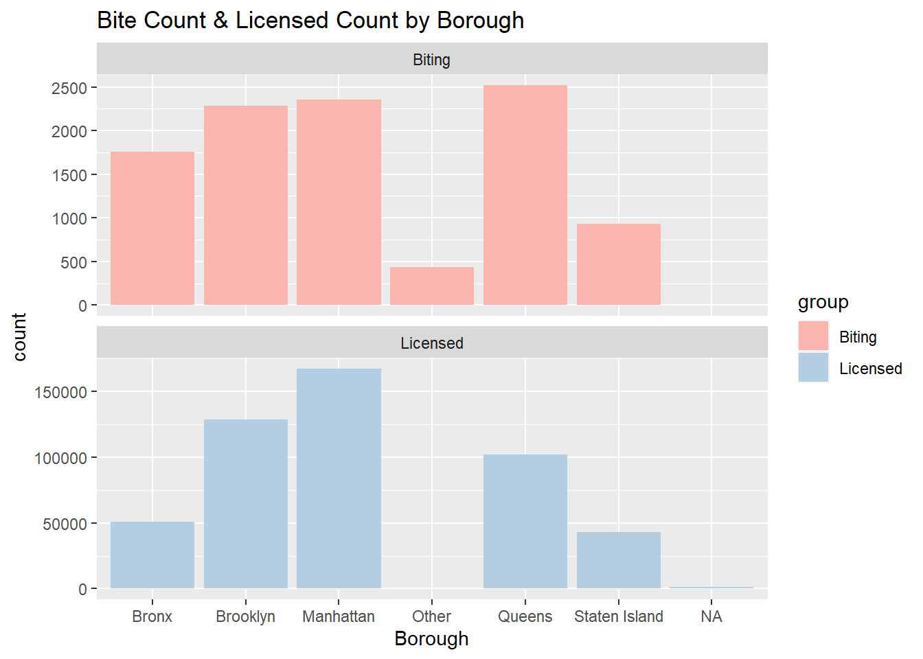Now we could compare the two bar charts for analysis. First, we noticed that “Queens” is not the borough with most dogs. In other words, it does not contain the most dogs, while it has the highest proportion of dog bites. Based on this, we can speculate that the management or related policies are not adequate in this borough and it is more at risk of being bitten by dogs in Queens. Second, for “Manhattan” and “Brooklyn”, they have largest population of dogs according to the second bar chart. Therefore, for the situation that dogs of “Manhattan” and “Brooklyn” cause the second and third most dog bite events, we cannot directly determine whether this is simply because their highest proportion in dogs or certain characteristics in these boroughs. Finally, we could summarize a general rule. For boroughs that contain not many dogs while have a high proportion of dog bites, i.e., Bronx and Queens, they may be more risky for dog bites. We could further analyze the dog bites laws and management polies in these boroughs. For boroughs that contain many dogs and have a large number of dog bites, i.e., Brooklyn and Manhattan, we could not directly speculate their risk and situation.