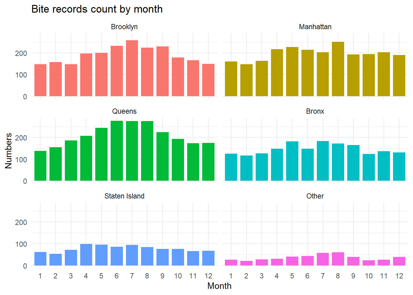 Since we have observed the differences between boroughs in 5.2, we are still curious about the relationship between dog bites and time in different boroughs. Therefore, we draw a matrix of bar charts to show the numbers of dog bites in different months in different boroughs.