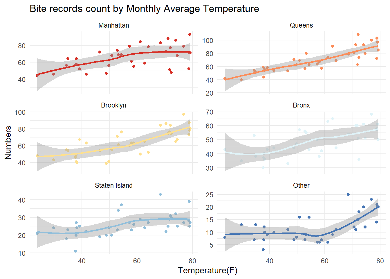 Obviously, the higher the temperature, the more dog bites. This is a general rule in almost all boroughs. We speculate that there are two reasons. First, the aggression of dogs may be influenced by temperature. Dogs may be more testy and aggressive on hot summer days. Second, dog owners may walk their dogs more often in summer. As we know, NYC is very cold in winter and dog owners may be afraid of cold and reduce their frequency of walking dogs. In most cases, dog bites occur outside the home of dog owners. Walking the dog less often will reduce the frequency of dog bites.
