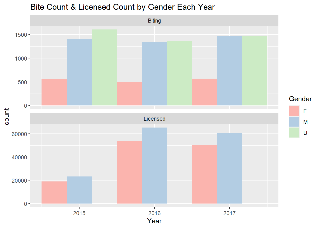 Now we could compare the two bar charts for analysis. Although more people prefer to keep male dogs, the difference in numbers between male ones and female ones is not that large, especially in 2015. Male dogs are only a little more than female dogs. Based on this, we can speculate that male dogs may have greater natural potential of being aggressive than female dogs.