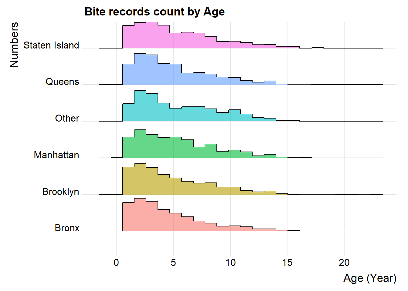 In this part, we analyze the relationship between the number of dog bites and the age of dogs. Since we have observed the differences between boroughs in 5.2, we are still curious about the relationship between dog bites and age in different boroughs. Therefore, we draw a ridgeline plot to show the numbers of dog bites with different ages of dogs in different boroughs.