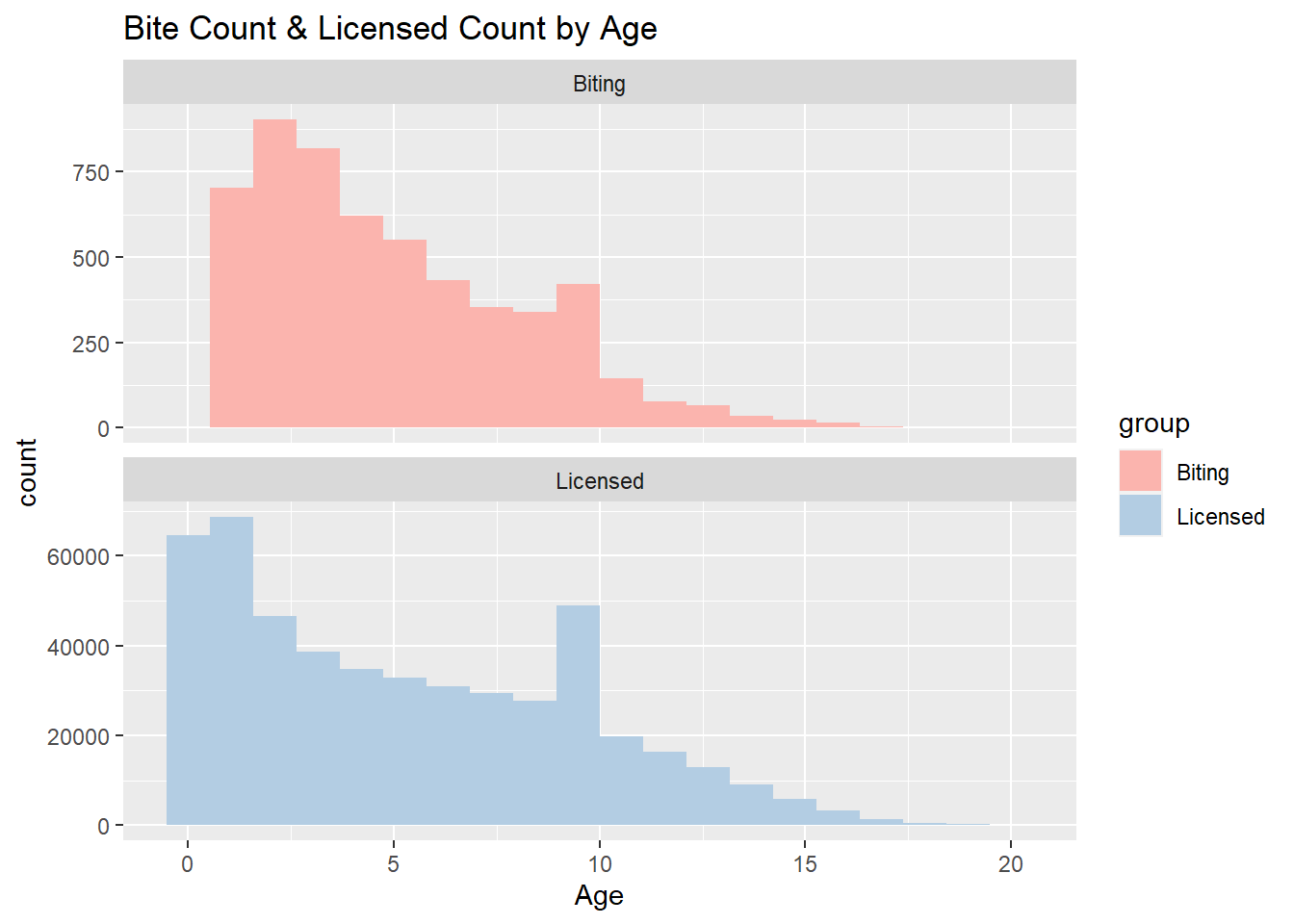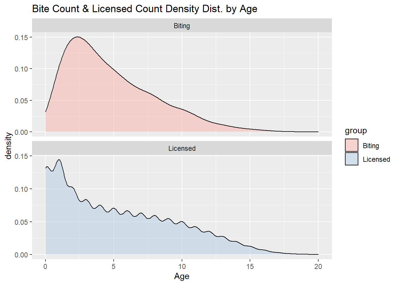 We found that younger (i.e., 1-5 years old) dogs have the largest number of dog bites in almost all boroughs. We aim to explore the real reason of this result. Why does younger dogs have the highest number of biting people? Because a large proportion of dog owners keep younger dogs and younger ones becomes common in NYC, or because of their natural potential of being aggressive? To answer this question, we introduce our auxiliary dataset (NYC Dog Licensing Dataset), which is much larger than the dog bites dataset, to roughly estimate the population composition of breeds. This dataset could roughly reflect the composition of dogs in NYC, which is adequate for our discussion. Note that in this auxiliary dataset, each record represents a unique dog license that was active during the year, but not necessarily a unique record per dog, since a license that is renewed during the year results in a separate record of an active license period. As a result, we do not need to worry about the relationship between the age and the growth of certain dogs. We just use this dataset to reflect the “roughly” composition of dogs with different ages in NYC. We draw a paired bar chart to compare them clearly. The first bar chart shows the numbers of dog bites of dogs with different ages, while the second one shows the numbers of (licensed) dogs with different ages which roughly reflects the composition and situation of dogs in NYC. We also show the corresponding density plots to for better analysis.