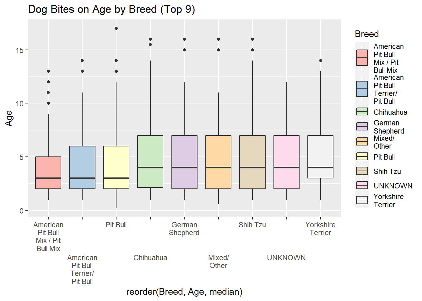 We are also curious about the distribution of ages for different breeds of dogs that bite people, thus we draw a box plot for analysis. In many breeds, a large proportion of dogs that bite people are young. The median ages of these dogs biting people are around 3-4 years in all breeds. Some breeds have outliers with a wide range. For example, Pit Bull even contains dog bite events in which the dogs are around 17.5 years old. The fluctuation degree of ages of dogs biting people in some breeds, e.g., American Pit Bull Mix / Pit Bull Mix, is relatively small.
